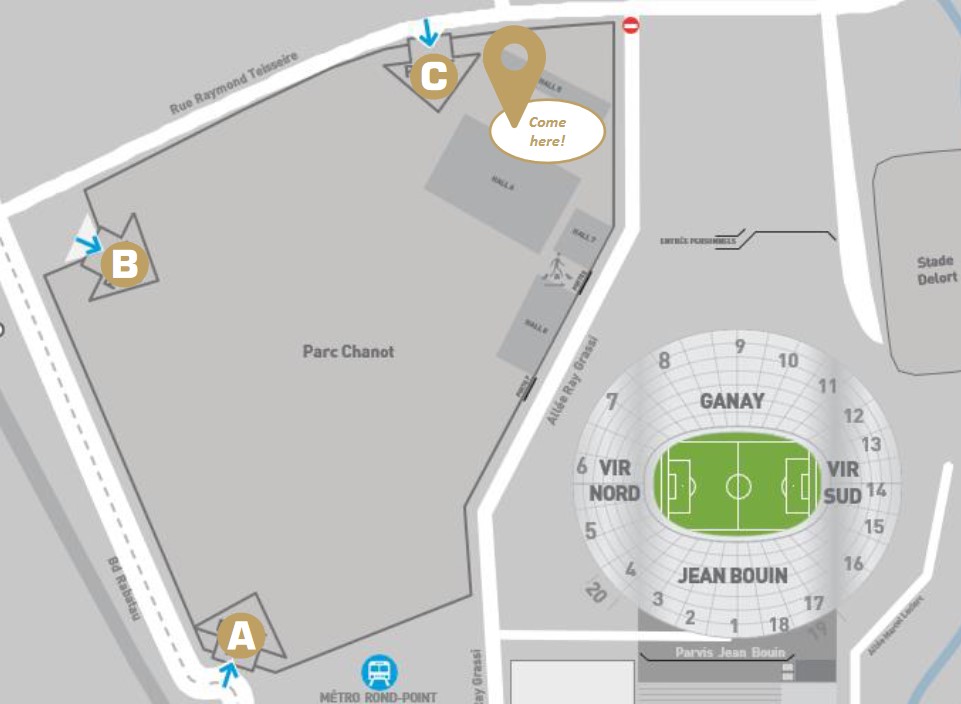 Το σημείο συνάντησης που ορίστηκε για τους φίλους της ομάδας μας που θα ταξιδέψουν στη Γαλλία είναι το PARC CHANOT, δίπλα στο Στάδιο Βελοντρόμ. Η συγκέντρωση των οπαδών της ΑΕΚ στο εν λόγω meeting point και η οργανωμένη μετάβασή τους εντός του γηπέδου είναι υποχρεωτική.