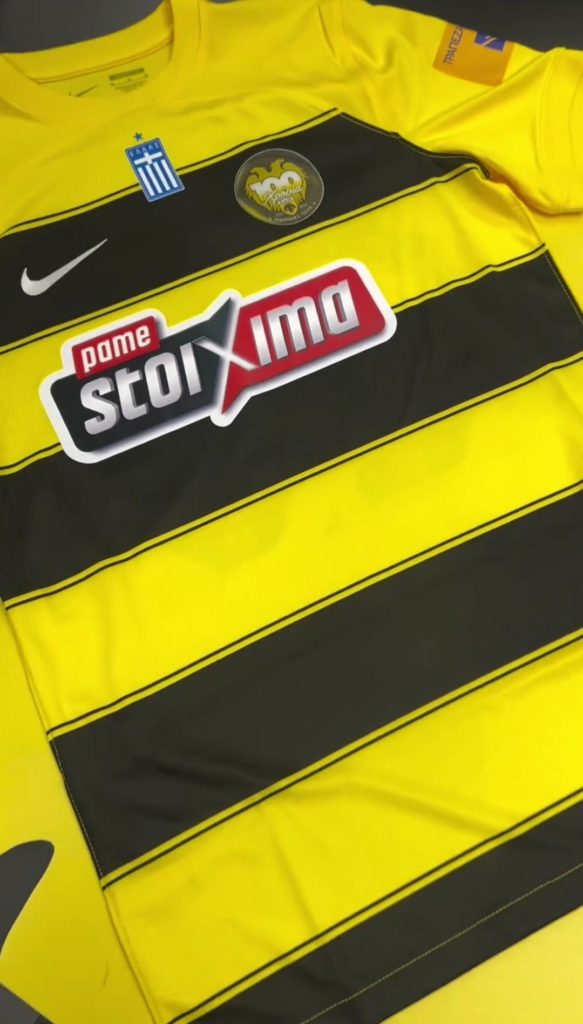 Με αυτή την φανέλα θα αγωνίζεται στο εξής η ΑΕΚΑΡΑ στα πλαίσια των εορτασμών για τα 100 χρόνια από τη ίδρυσή της. Η φωτογραφία: