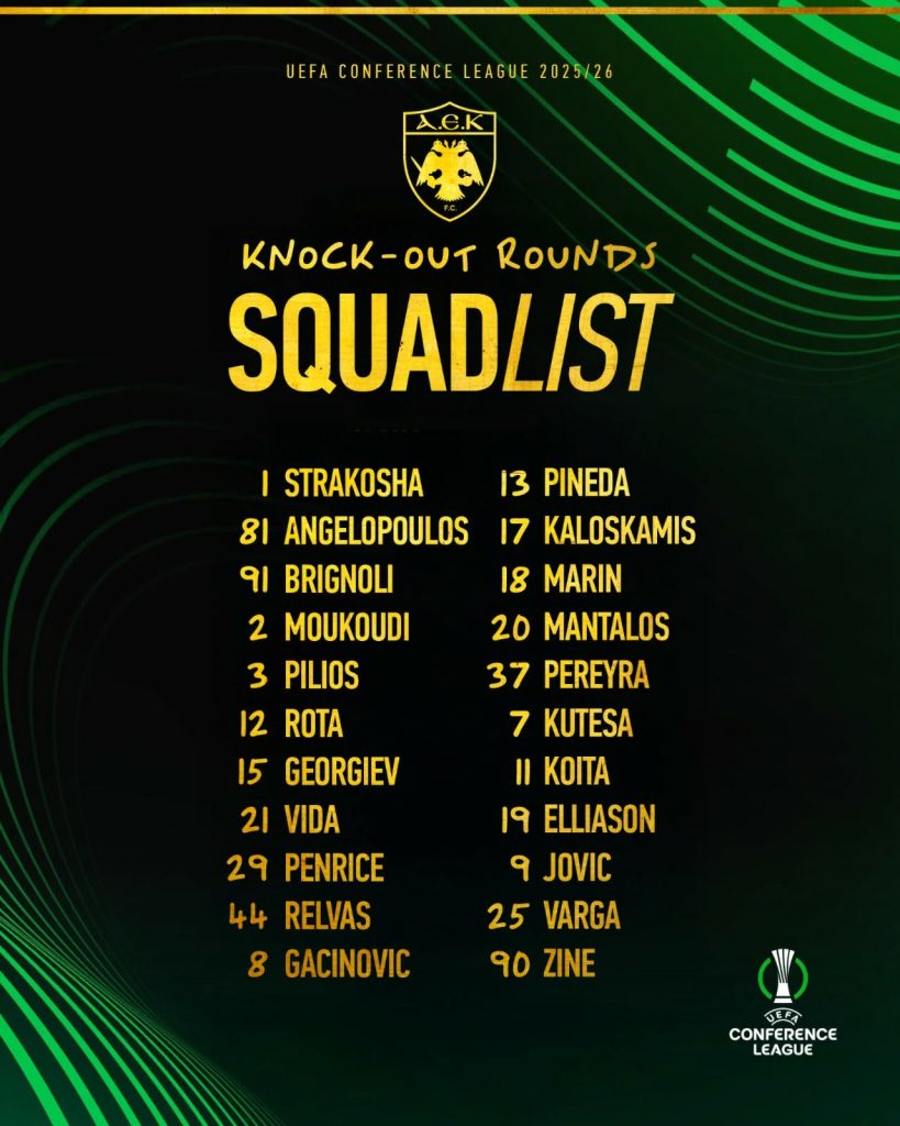 Γνωστή έγινε η ευρωπαϊκή λίστα με την οποία θα πορευτεί η ΑΕΚ στη συνέχεια του ευρωπαϊκού της ταξιδιού, με 3 αλλαγές σε σχέση με την ισχύουσα. Συγκεκριμένα, τη θέση του Πιερό πήρε ο Βάργκα, αυτή του Γκρούγιτς πήρε ο Καλοσκάμης, ενώ αντί του Χρυσόπουλου που αποχώρησε δηλώθηκε ο Γκεοργκίεφ.