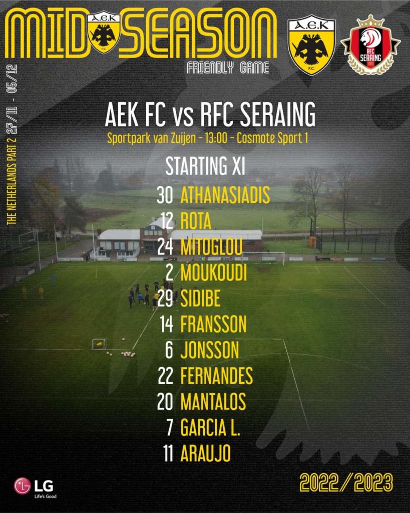 Ο Ματίας Αλμέιδα ανακοίνωσε την αρχική ενδεκάδα της ΑΕΚ για τον φιλικό αγώνα απέναντι στην Σερέν. Ο αγώνας θα ξεκινήσει στις 13:00, ενώ η θερμοκρασία αγγίζει τους 0°C.