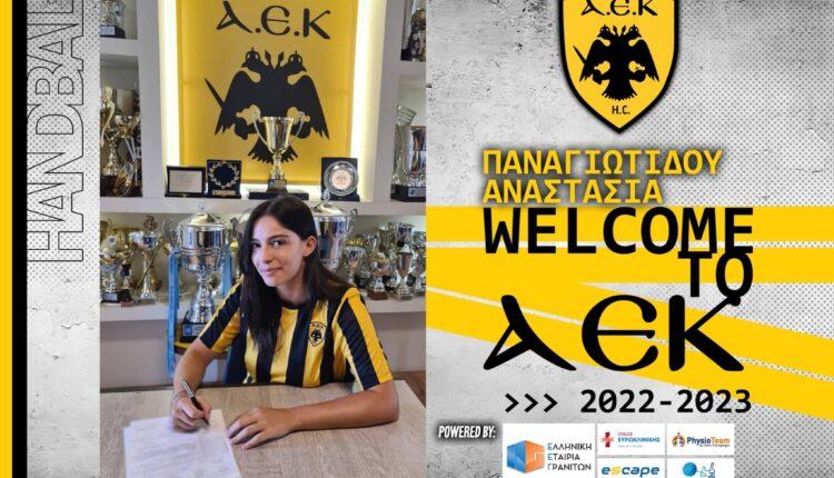 “Η ΑΕΚ βρίσκεται στην ευχάριστη θέση να ανακοινώσει την έναρξη της συνεργασίας της με την Αναστασία Παναγιωτίδου. Η 24χρονη (14/11/1998) διεθνής αριστερή εξτρέμ, ύψους 1,73 μ., υπέγραψε μονοετές συμβόλαιο και εντάσσεται στο δυναμικό της γυναικείας ομάδας Χάντμπολ της ΑΕΚ.
