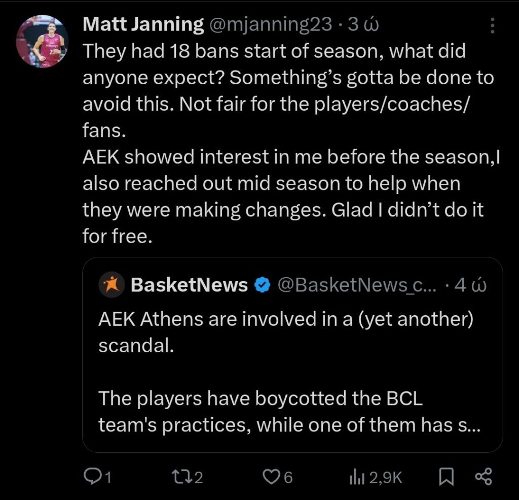 Ο Γεωργιανός Ματ Τζάνινγκ της Μπασκόνια, που απασχόλησε τον χειμώνα την ΑΕΚ, προχώρησε σε tweet μετά την απόφαση των παικτών της για αποχή: