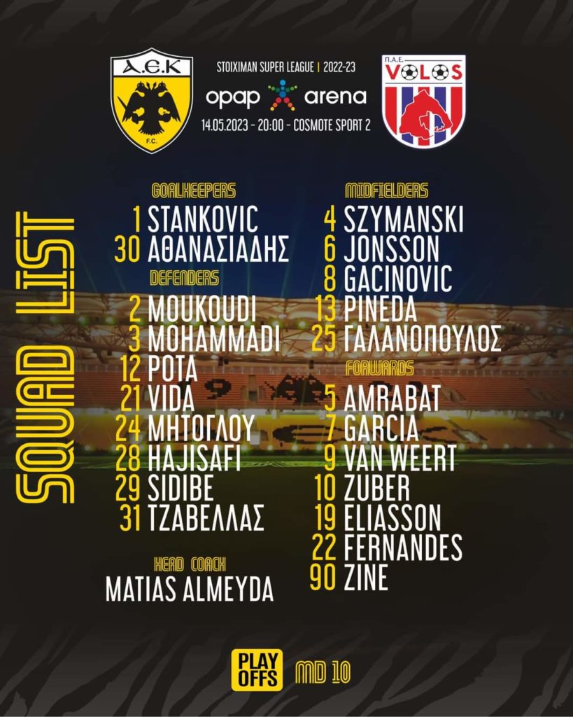 Τον Βόλο υποδέχεται αύριο, Κυριακή (20:00) η ΑΕΚ για την τελευταία αγωνιστική των πλέι οφ της Super League, ενώ χρειάζεται μόλις 1 βαθμό για να πανηγυρίσει την κατάκτηση του πρωταθλήματος.